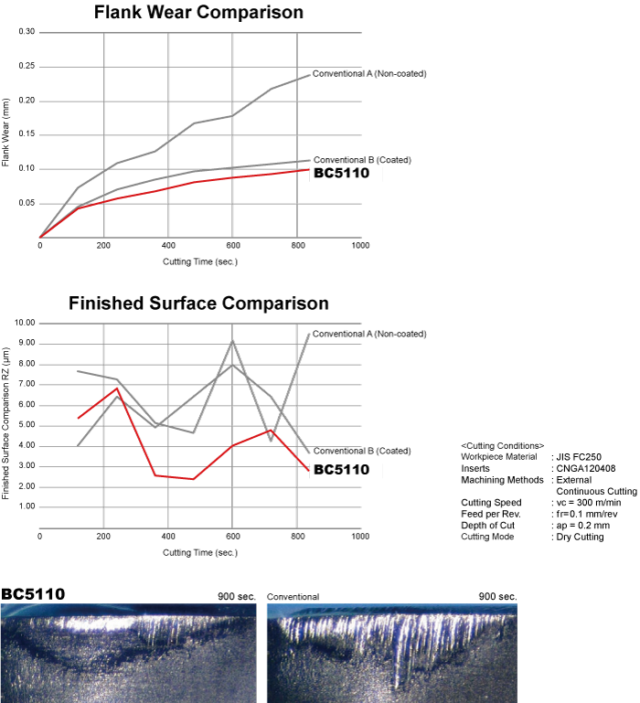 BC5110 uses a tough substrate with a highly hard coating to provide excellent chipping and wear resistance.