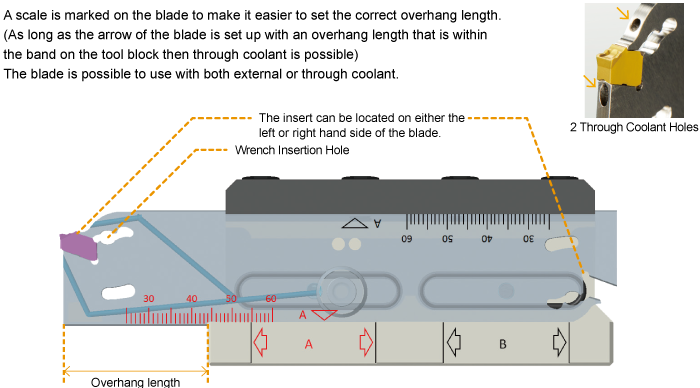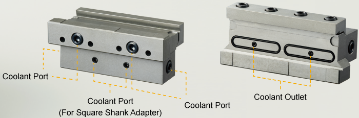 There are 6 coolant ports designed into the tool block. This makes it easier for the end user to set up the tool block and blade to a configuration that suits their needs. If necessary it is also possible to use coolant hose. The ejection type coolant also improves cutting edge cooling and chip evacuation.