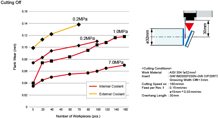 The 2 coolant holes used in the blade are capable of using high coolant pressures of up (7MPa), this is achieved by using as large as possible a through coolant hole diameter. The ejection holes are located close to the cutting edge so as to improve the cutting edge cooling effect and increasing wear resistance.
