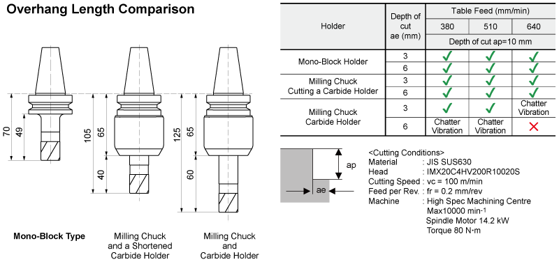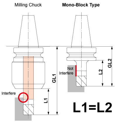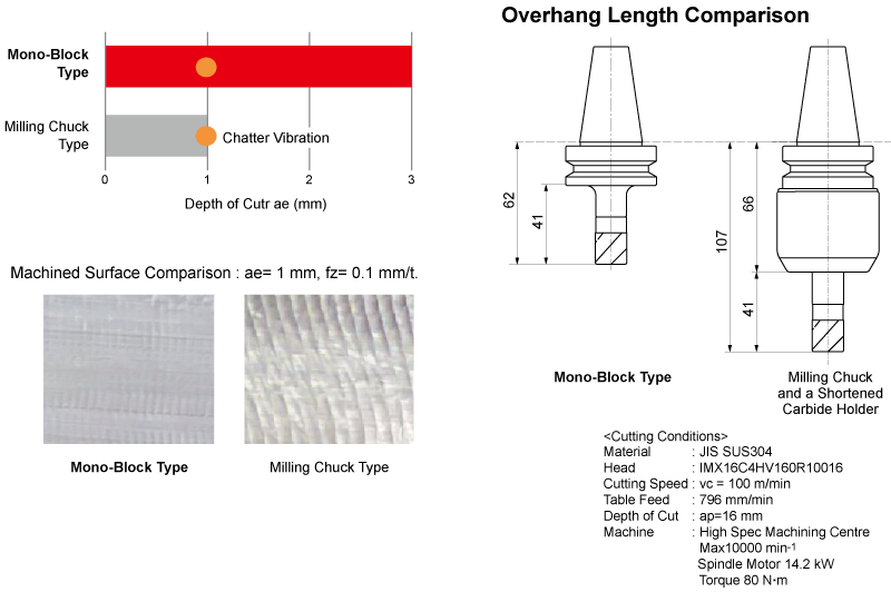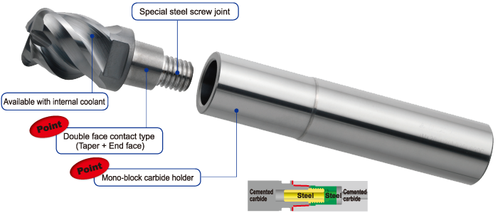 The mono-block type holder greatly reduces tool overhang, allowing stable machining even with large diameter tools, achieving high efficiency machining.