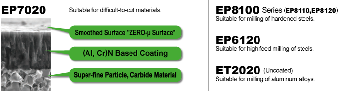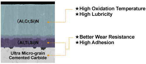 The combination of the (Al,Cr,Si)N coating (newly-developed), which has a high oxidation temperature and high lubricity,together with the (Al,Ti,Si)N coating, which has better wear resistance and high adhesion, allows high strength hardened steel to be machined.