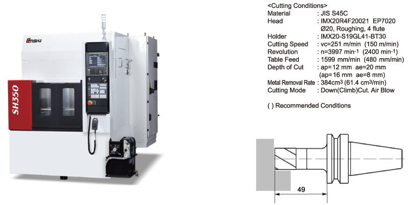 When rough machining steel (S45C), a metal removal rate of 384 cm3/min was achieved, six times the recommended rate.