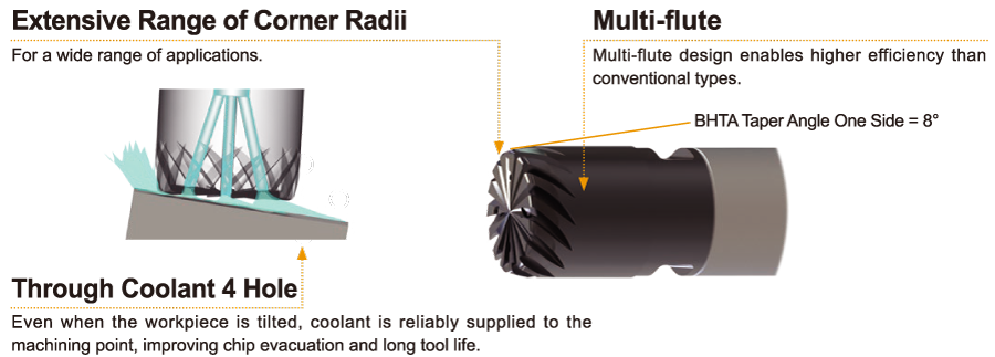 Corner radius, Taper head, Multi-flute, with coolant hole
