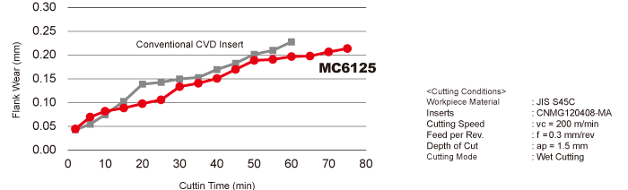 The thick coating exclusively for MC6125 highly suppresses early wear.