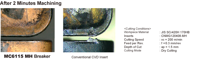 When comparing the high edge strength MH breaker with a conventional low resistance chip breaker, it shows that MC6115 accomplishes both high welding and wear resistance.