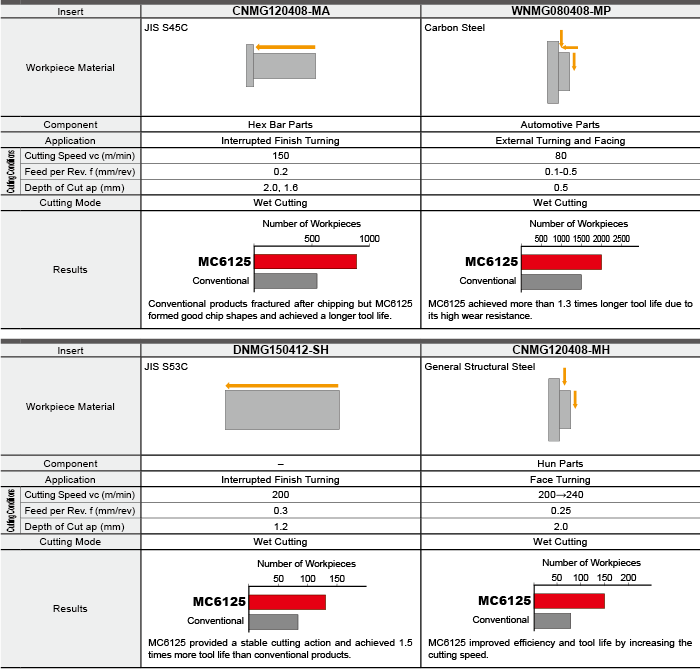 MC6125 uses a new surface treatment for the cutting edge for increased stability. Additionally, the seating faces also have a special smooth surface treatment that provides improved clamping stability to enable a wider range of applications.