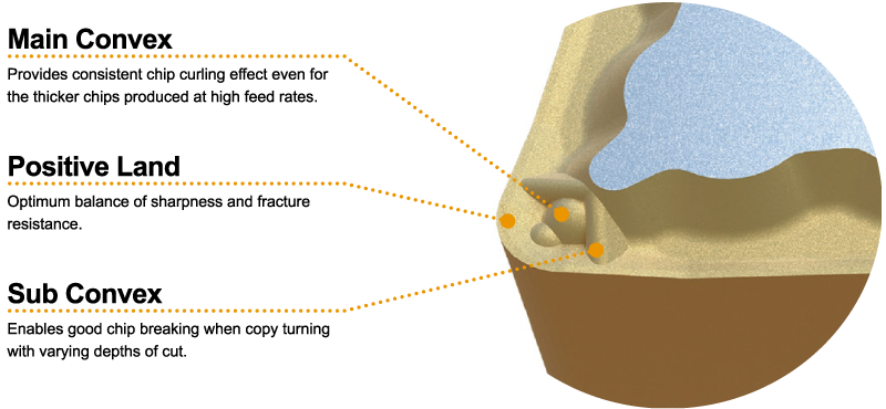 The combination of a positive land cutting edge shape and a two-stage protrusion optimises chip generation at low depths of cut, high feed conditions, thereby reducing machining times.