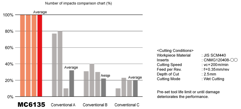 MC6135 shows high stability even during interrupted cutting and can be used over a wide area of applications.