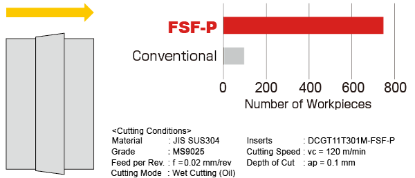 With fewer burrs and good chip evacuation, it was possible to turn 750 pieces compared to the tool life of 150 pieces with conventional products.