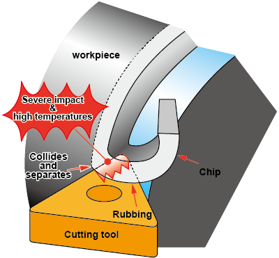 The figure on the right shows the condition of a cutting edge during machining. The cutting edge cuts the workpiece and chips are produced. The temperature at the top of the cutting edge becomes as high as 800°C because of impact and friction.