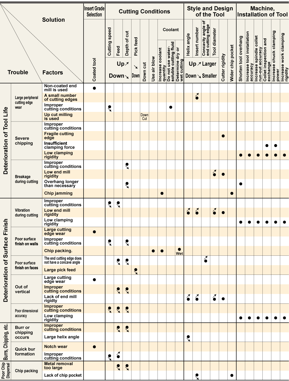 Deterioration of Tool Life / Deterioration of Surface Finish / Burrs, Chipping, etc. / Poor Chip Dispersal