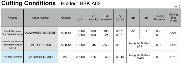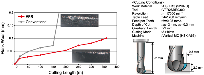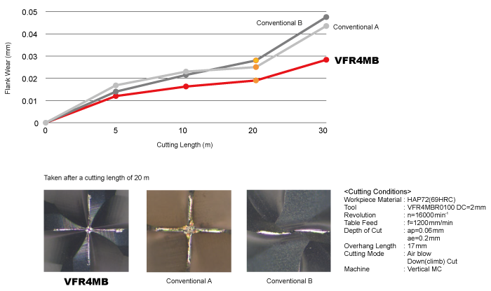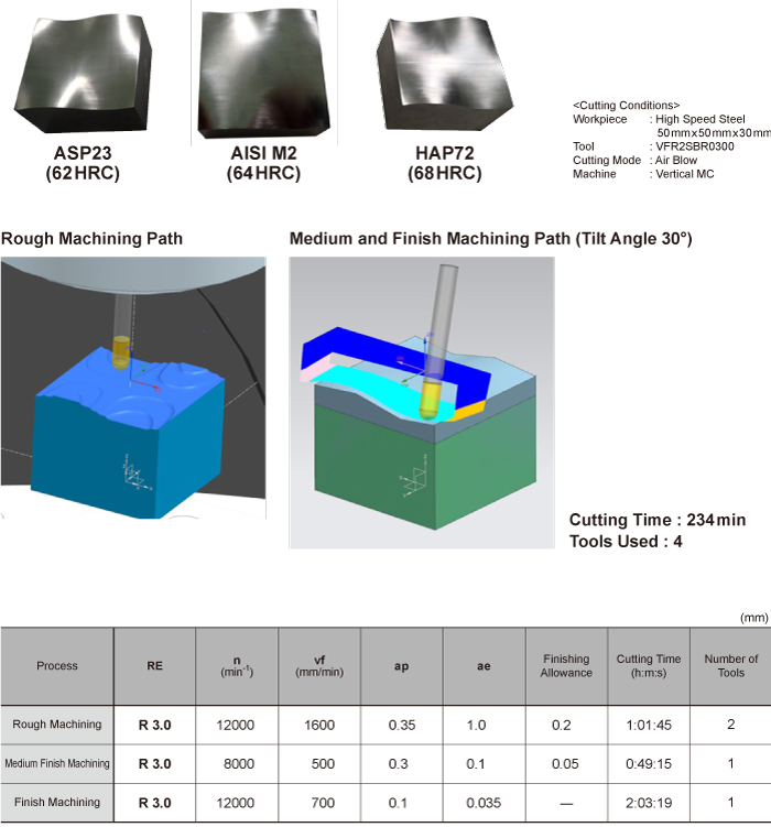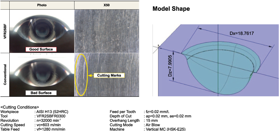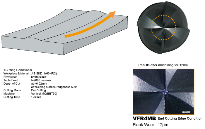 Comments from Customer Evaluation· VFR4MB showed almost no wear and no change in surface roughness even though the tip was overworked on the contours of a press mould. · By making it possible to machine with a single end mill, the costs were reduced and the time problems which required a tool change every 2 hours of machining or more were resolved. In addition, the feed rate could be increased by 1.5 which shortened the machining time. |