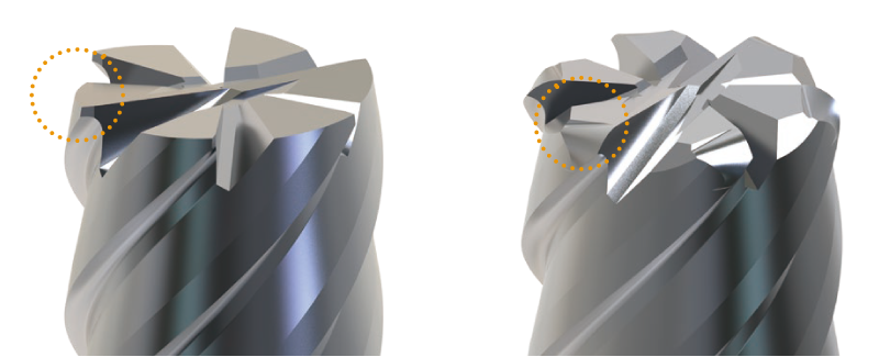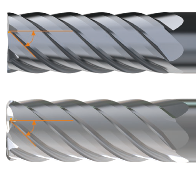 To successfully acheive high-speed machining with multi-flute end mills, high helix angle flute geometry provided the sharpness and negative rake end cutting edges provided the strength and reliability.